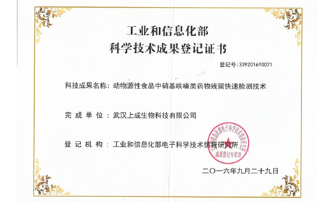 2016年9月27日,武漢上成生物科技有限公司研究成果“動(dòng)物源性食品中硝基呋喃類藥物殘留快速檢測技術(shù)”通過國家科技部科研技術(shù)成果評價(jià)。