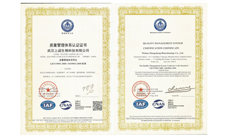 2016年7月6日,武漢上成生物科技有限公司通過了ISO9001:2008質(zhì)量管理體系的認(rèn)證,并順利取得證書。