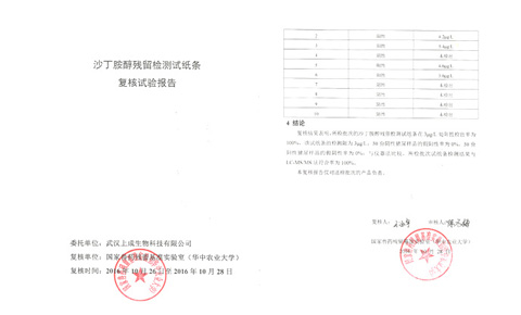 2016年10月26日,上成生物將苯乙醇胺A殘留檢測試紙條、克倫特羅殘留檢測試紙條、萊克多巴胺殘留檢測試紙條和沙丁胺醇?xì)埩魴z測試紙條四款膠體金檢測試紙條送到國家獸藥殘留基準(zhǔn)實(shí)驗(yàn)室(華中農(nóng)業(yè)大學(xué))做復(fù)核實(shí)驗(yàn)。實(shí)驗(yàn)內(nèi)容包括:檢測限、假陽性率、假陰性率和儀器對比。經(jīng)過實(shí)驗(yàn)檢測產(chǎn)品全部達(dá)到國家標(biāo)準(zhǔn)。