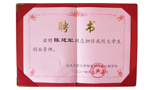 2014年武漢工程大學郵電與信息工程學院聘請陳建軍同志擔任大學生創(chuàng)業(yè)導師。